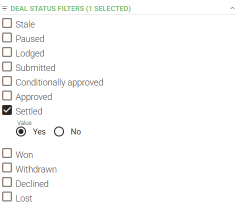 Under Deal Filters, apply a filter for Deal Status = Settled Loans.